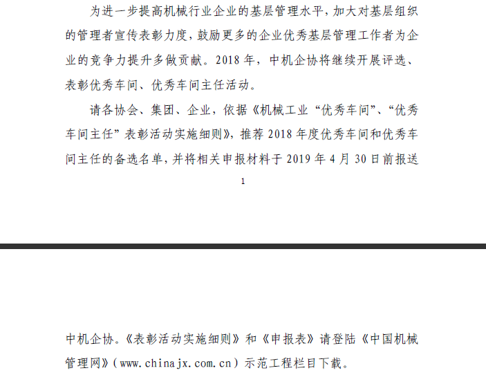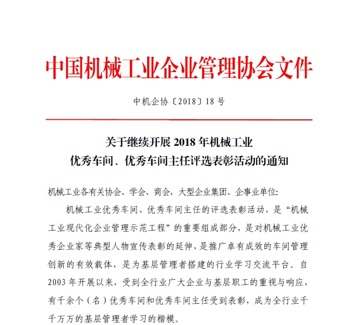 為表彰車間主任的優(yōu)異業(yè)績(jī),總結(jié)、宣傳企業(yè)基層管理工作的經(jīng)驗(yàn),為廣大車間主任創(chuàng)建一個(gè)相互學(xué)習(xí)、相互交流的平臺(tái),中國機(jī)械工業(yè)企業(yè)管理協(xié)會(huì)(以下簡(jiǎn)稱“中機(jī)企協(xié)”)根據(jù)《機(jī)械工業(yè)“十三五”企業(yè)管理發(fā)展規(guī)劃的建議》和《關(guān)于機(jī)械工業(yè)現(xiàn)代化管理示范工程實(shí)施意見》中,繼續(xù)組織開展機(jī)械工業(yè)“優(yōu)秀車間”、“優(yōu)秀車間主任”表彰活動(dòng)的精神,特制定本實(shí)施細(xì)則。