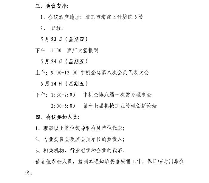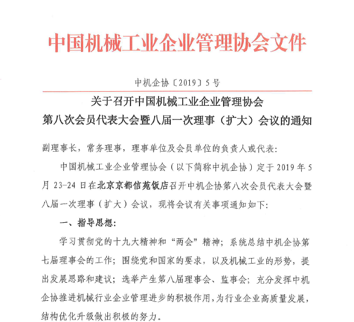 中機(jī)企協(xié)第八次會(huì)員代表大會(huì)暨八屆一次理事(擴(kuò)大)會(huì)議通知