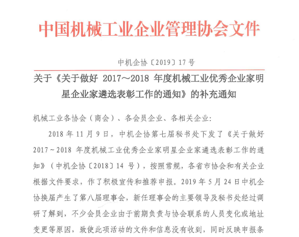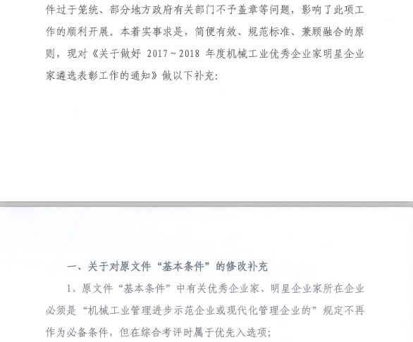 關(guān)于做好2017~2018年度機械工業(yè)優(yōu)秀企業(yè)家明星企業(yè)家遴選表彰工作的補充通知