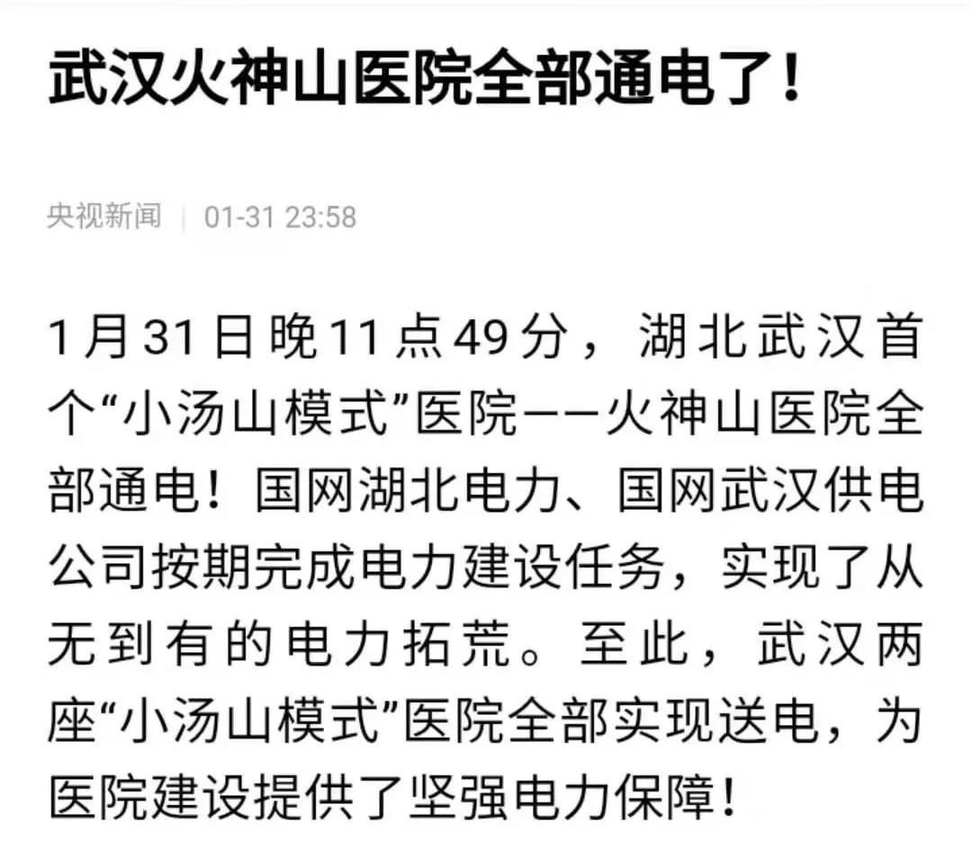 眾人拾柴,點亮火神山。1月31日晚11點49分,湖北武漢首個“小湯山模式”醫(yī)院——火神山醫(yī)院全部通電。