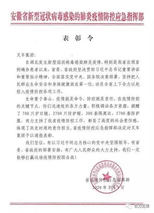 安徽省疫情防控指揮部向安徽叉車集團(tuán)發(fā)來的表彰令